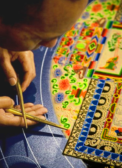 She said that Losang Samten would work on it all day, every day for an entire month, lightly rubbing one chakpu, a narrow metal funnel, over another, to arrange thin strands of brightly colored sand into elaborate patterns.