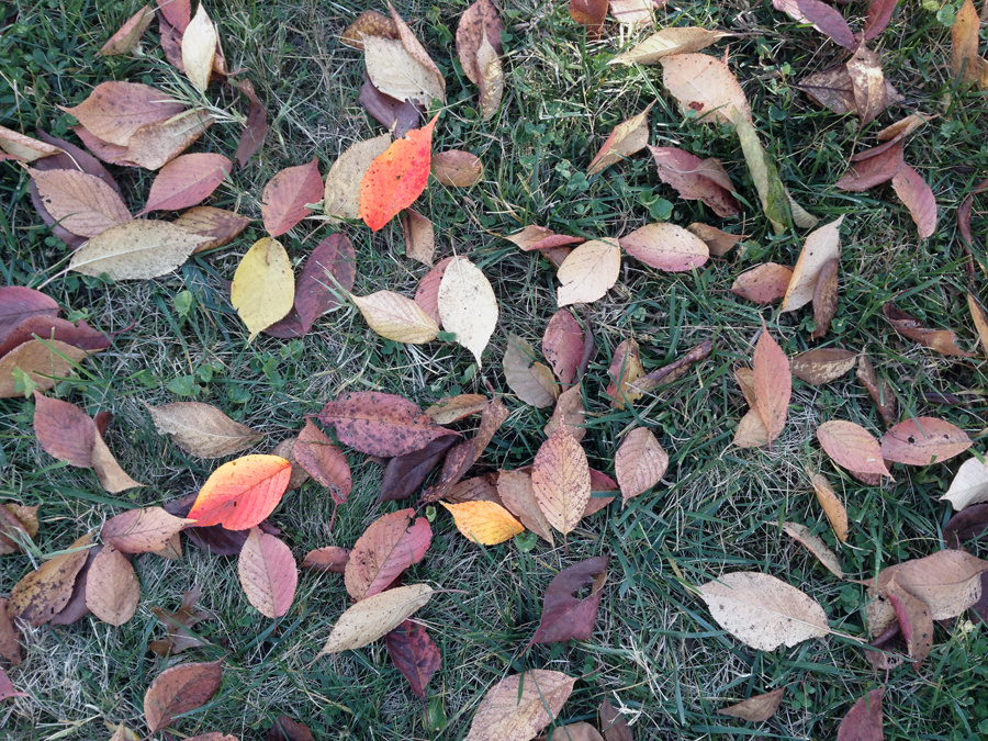 “Let’s keep it,” she said as I handed it to her. And then, almost immediately, we spotted another perfect leaf, this one deep red. She leaned over and picked it up herself. Soon we were leafspotting nonstop, both of us stooping and rising and exclaiming over each treasure.